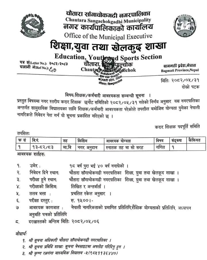 Math Teacher Full Time Sindhupalchowk Posted 2 weeks ago Applications have closed Website Chautara Sanggachokgadhi Nagarpalika JOB OPPORTUNITY Position: Teacher Level: Secondary Subject: Math Number of Openings: 1 Location: Sindhupalchowk Chautara Sanggachokgadhi Nagarpalika Phone No.: 9851136440 Tagged as: Sindhupalchowk