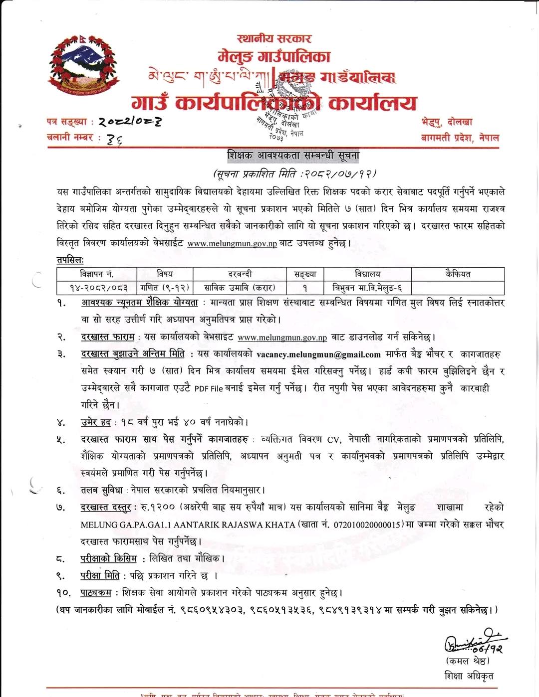 Math Teacher Full Time Dolakha Posted 3 weeks ago Applications have closed Website Melunga Gaunpalika JOB OPPORTUNITY Tagged as: Dolakha