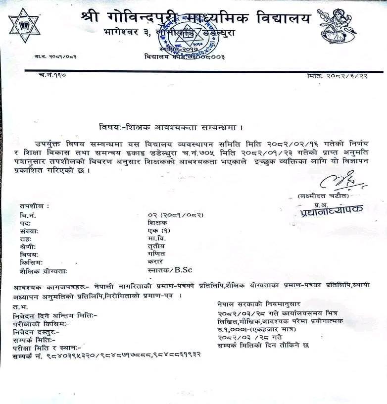 Math Teacher Full Time Dadeldhura Posted 3 months ago Applications have closed Shree Govindpuri Madhyamik Vidyalaya JOB OPPORTUNITY