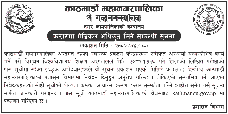 Medical Officer Full Time Kathmandu Posted 2 months ago Applications have closed Website Kathmandu Metropolitan City JOB OPPORTUNITY Source: Gorkhapatra, 24 July, 2025 Tagged as: Kathmandu