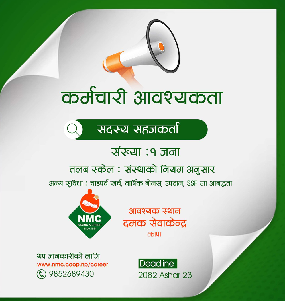 Member Facilitator Full Time Jhapa Posted 3 months ago Applications have closed Website Nepal Multipurpose Cooperative Ltd. JOB OPPORTUNITY Tagged as: Jhapa