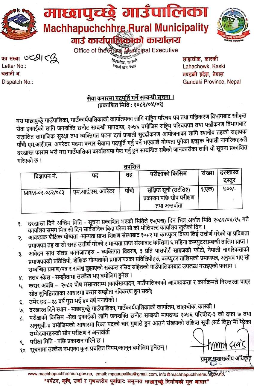 MIS Operator Full Time Kaski Posted 3 months ago Applications have closed Website Machhapuchhre Gaunpalika JOB OPPORTUNITY Position: MIS Operator No. of Vacancy: 1 Location: Kaski Tagged as: Kaski