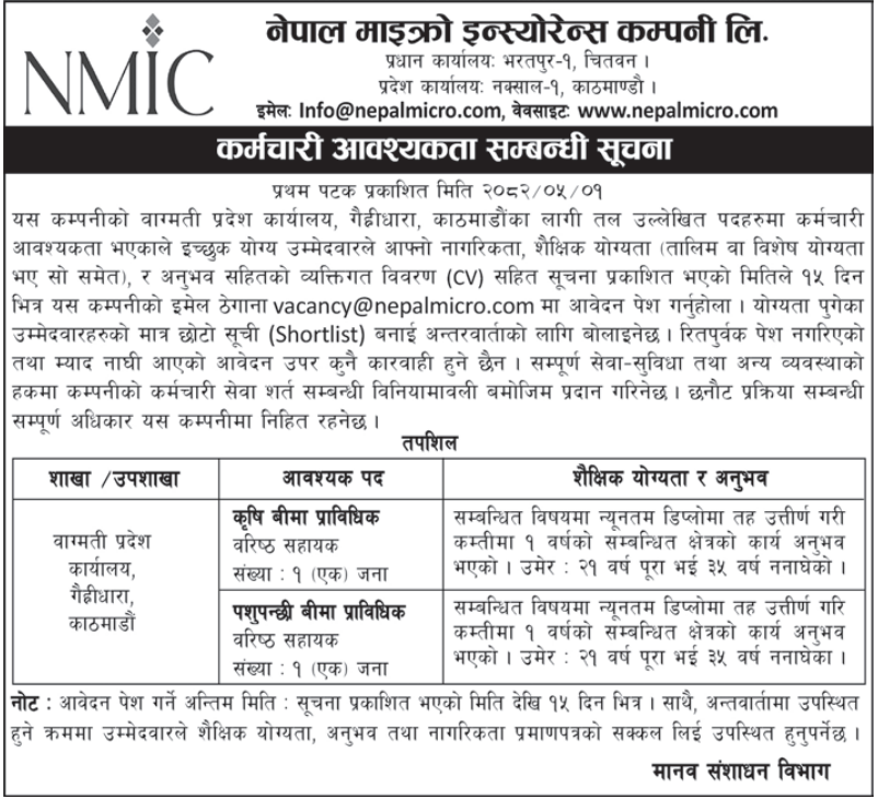 Senior Assistant Full Time Anywhere Posted 2 months ago Applications have closed Website Nepal Micro Insurance Company Ltd. JOB OPPORTUNITY