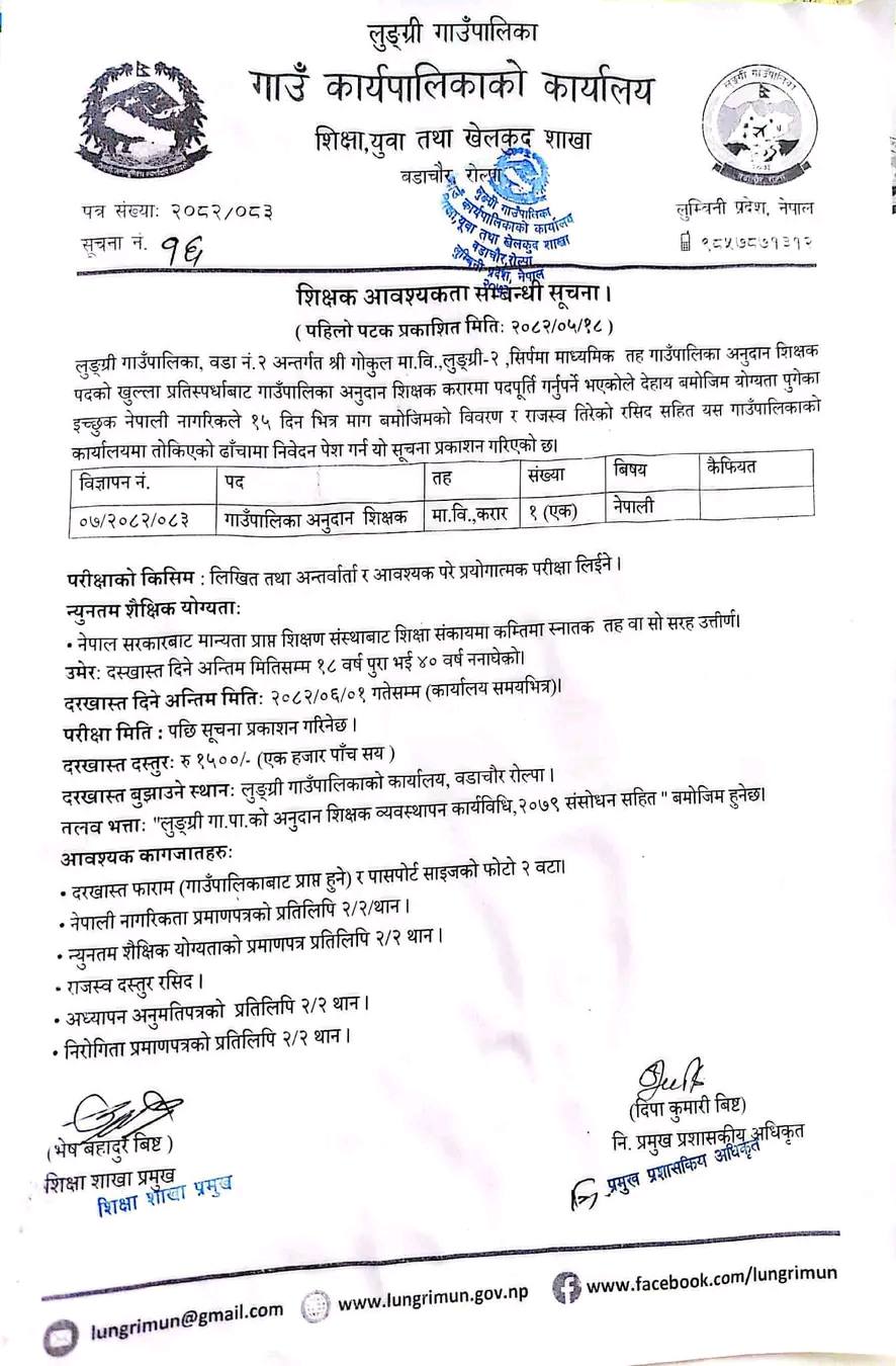 Nepali Teacher Full Time Rolpa Posted 4 weeks ago Applications have closed Website Lungri Gaunpalika JOB OPPORTUNITY Position: Teacher Level: Secondary Subject: Nepali No. of Vacancy: 1 Location: Rolpa Lungri Gaunpalika Tagged as: Rolpa