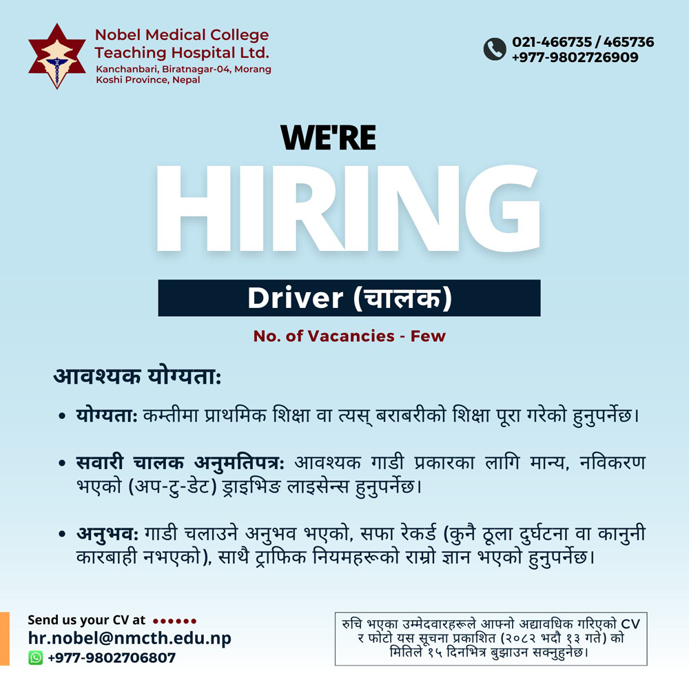Driver Full Time Morang Posted 1 month ago Applications have closed Website Nobel Medical College JOB OPPORTUNITY Position: Driver No. of Vacancy: Few Location: Biratnagar, Morang Send us your CV at: hr.nobel@nmcth.edu.np Phone No.: 9802706807 Tagged as: Morang