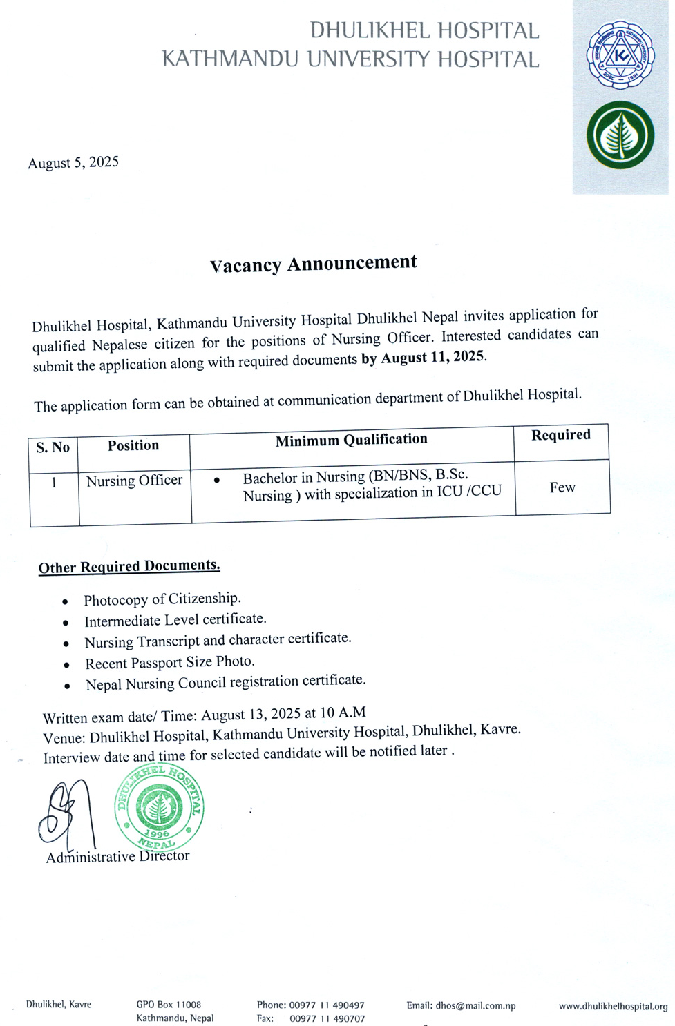 Dhulikhel Hospital, Kathmandu University Hospital Dhulikhel Nepal Invites application for qualified Nepalese citizen for the positions of Nursing Officer. Interested candidates can submit the application along with required documents by August 11, 2025