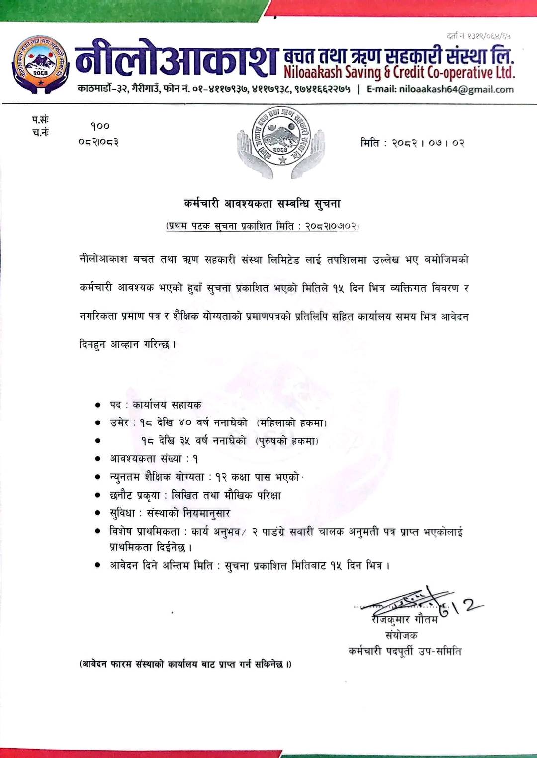 Office Assistant Full Time Kathmandu Posted 4 weeks ago Applications have closed Niloaakash Saving & Credit Cooperative Ltd. JOB OPPORTUNITY Position: Office Assistant No. of Vacancy: 1 Location: Kathmandu Niloaakash Saving & Credit Cooperative Ltd. Email: niloaakash64@gmail.com Phone No.: 01-4117937, 4117938 Mobile No.: 9741662275 Tagged as: Kathmandu