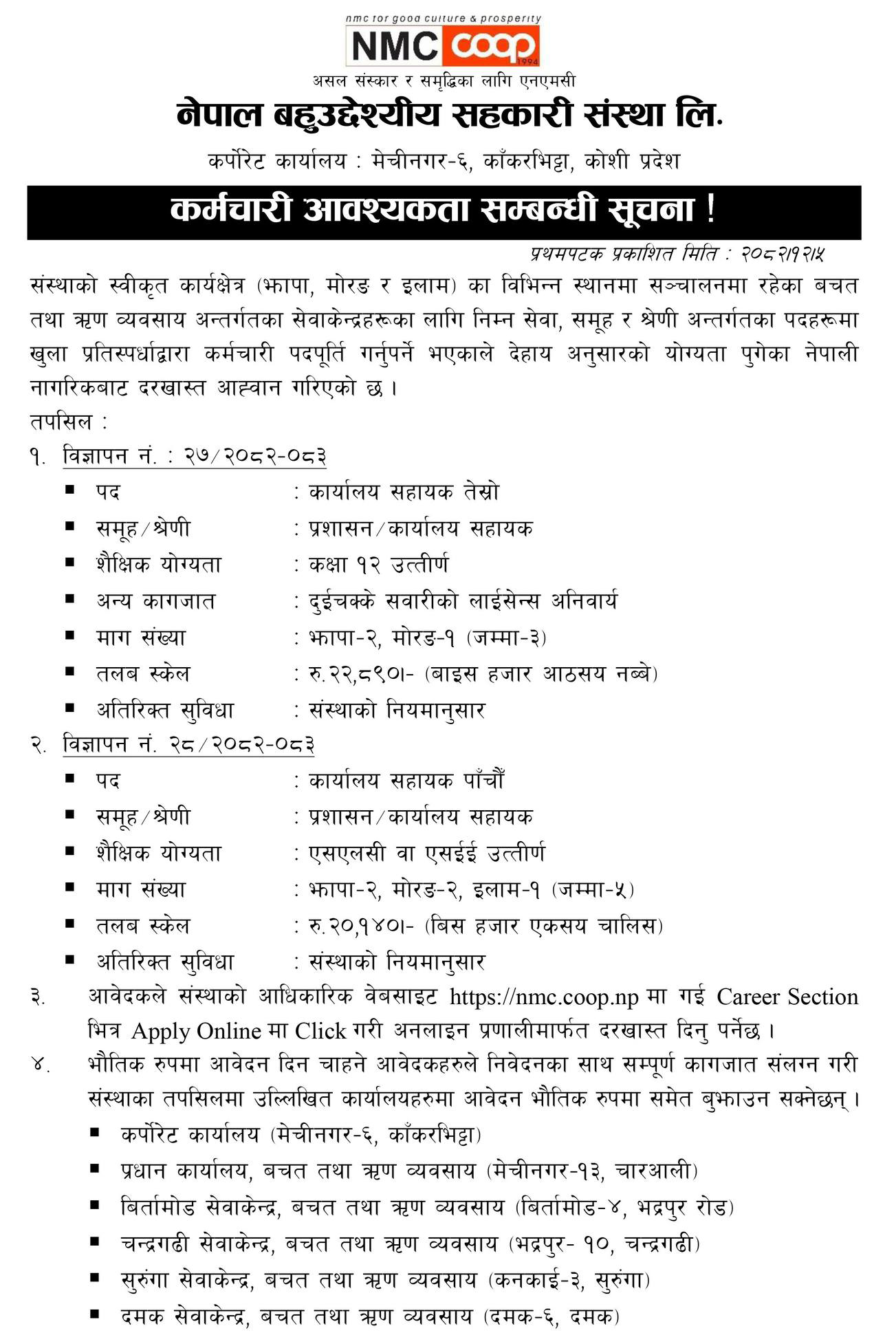 Office Assistant Full Time illam, Jhapa, Morang Posted 3 weeks ago Applications have closed Website Nepal Multipurpose Cooperative Society Ltd. JOB OPPORTUNITY Tagged as: Illam, Jhapa, Morang