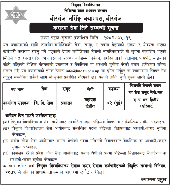 Office Assistant Full Time Birgunj Posted 4 weeks ago Applications have closed Website Birgunj Nursing Campus JOB OPPORTUNITY Position: Office Assistant No. of Vacancy: 2 Location: Birgunj Birgunj Nursing Campus Email: info@bnc.tu.edu.np Tagged as: Birgunj