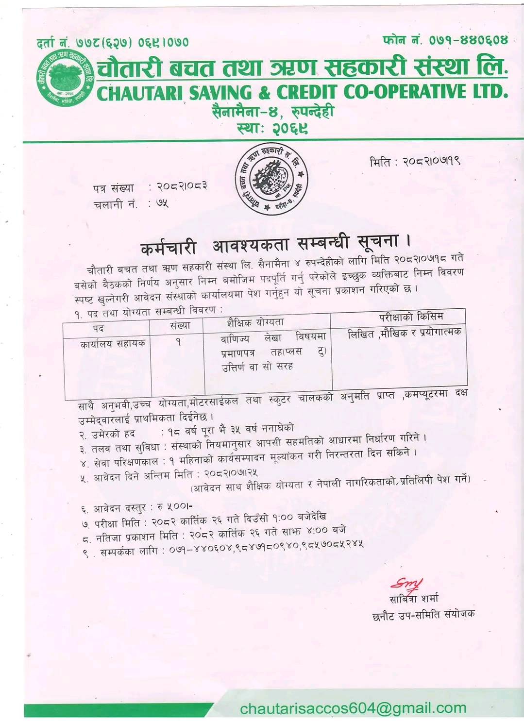 Office Assistant Full Time Rupandehi Posted 1 week ago Applications have closed Chautari Saving and Credit Cooperative Ltd. JOB OPPORTUNITY Position: Office Assistant No. of Vacancy: 1 Location: Sainamaina, Rupandehi Phone No.: 071-440604, 9847180940, 9857085245 Chautari Saving & Credit Cooperative Tagged as: Rupandehi