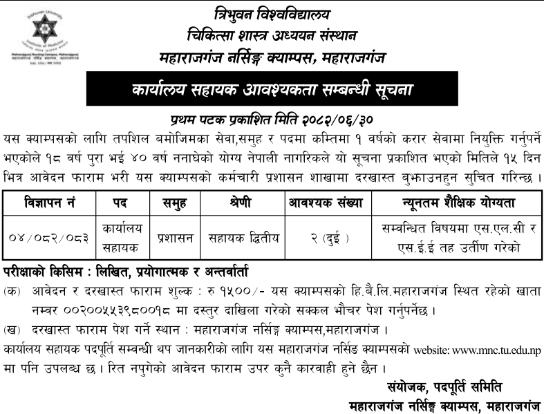 Office Assistant Full Time Kathmandu Posted 1 week ago Closes: October 30, 2025 Website Maharajgunj Nursing Campus JOB OPPORTUNITY Position: Office Assistant No. of Vacancy: 1 Location: Kathmandu Maharajgunj Nursing Campus Website: https://mnc.tu.edu.np/ Tagged as: Kathmandu