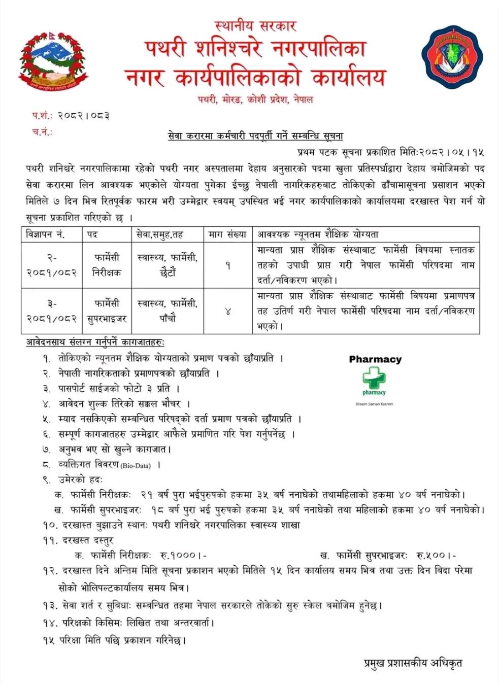 Pharmacy Supervisor, Pharmacy Inspector Full Time Morang Posted 1 month ago Applications have closed Website Pathari Shanishchare Nagarpalika JOB OPPORTUNITY Position: Pharmacy Supervisor No. of Vacancy: 1 Position: Pharmacy Inspector No. of Vacancy: 1 Location: Morang Pathari Shanishchare Nagarpalika Tagged as: Morang