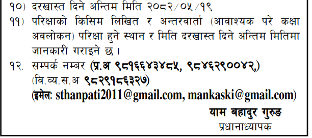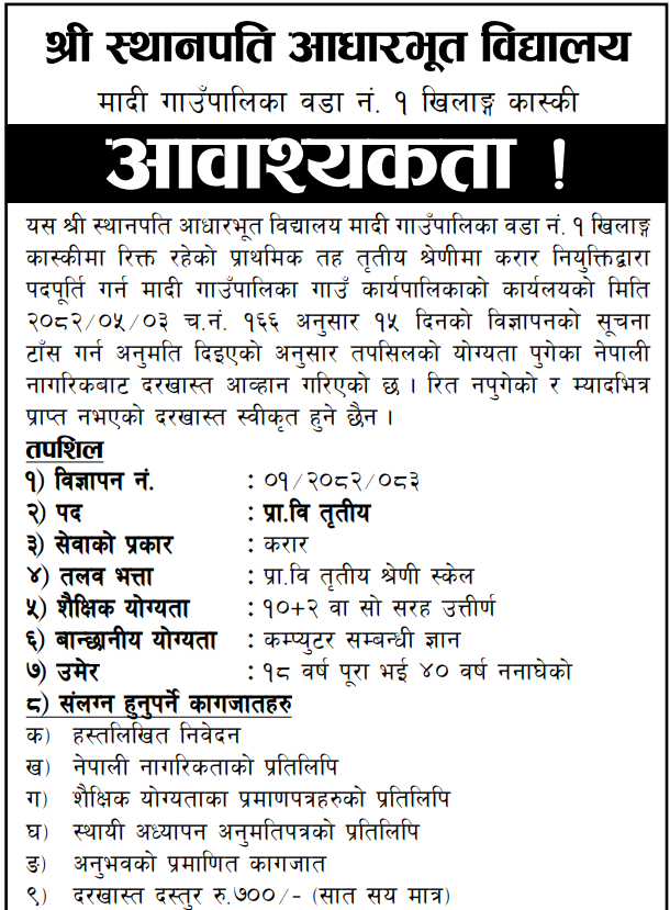 Primary Level Teacher Full Time Pokhara, Kaski Posted 1 month ago Applications have closed Shree Sthanpati Adharbhut Vidyalaya JOB OPPORTUNITY Position: Teacher Level: Primary No. of Vacancy: 1 Location: Kaski, Pokhara Shree Sthanpati Adharbhut Vidyalaya Email: sthanpati2011@gmail.com, mankaski@gmail.com Phone No.: 9816643485, 9846290042, 9829186327 Tagged as: Pokhara