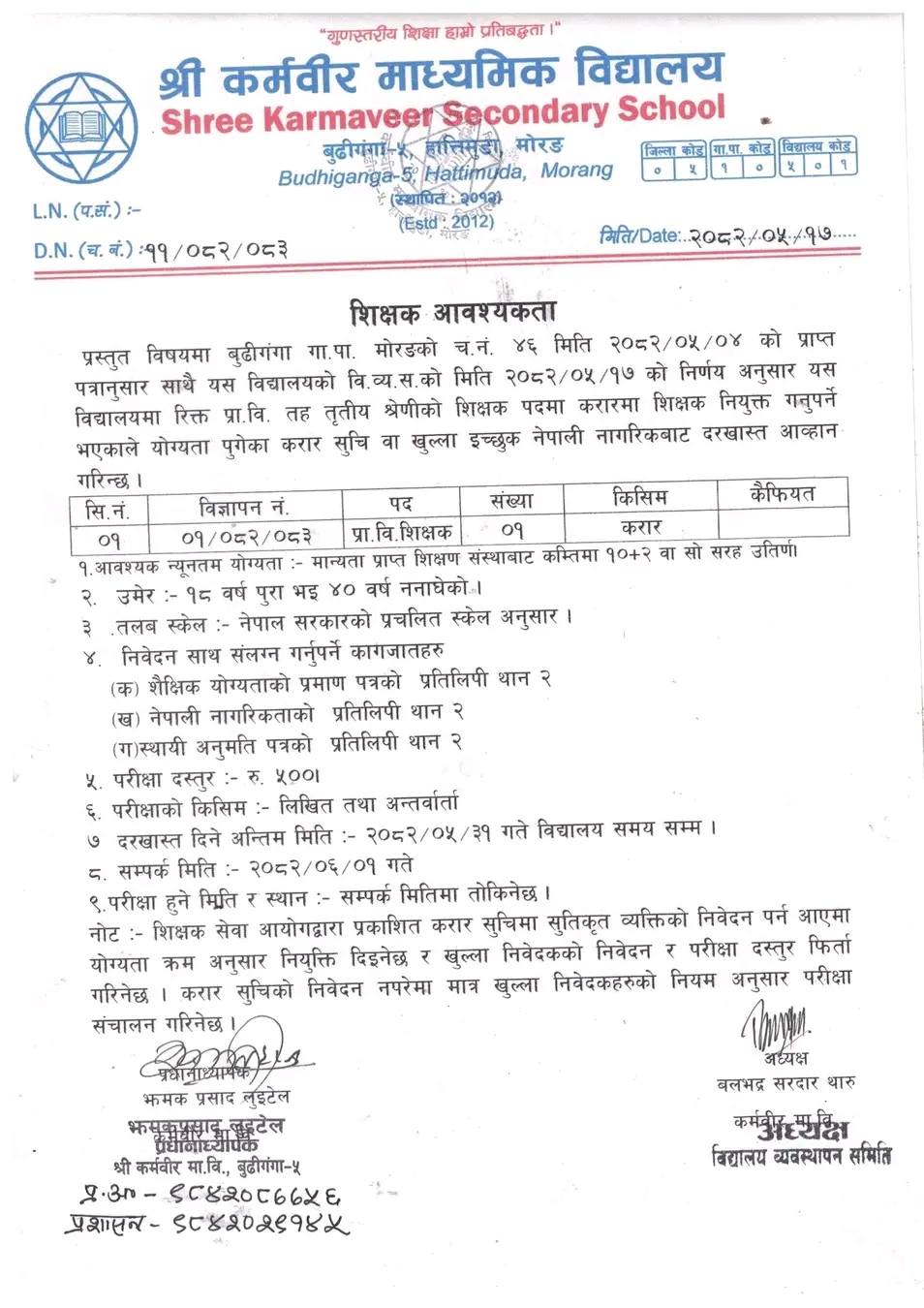 Primary Level Teacher Full Time Morang Posted 4 weeks ago Applications have closed Shree Karmaveer Madhyamik Vidyalaya JOB OPPORTUNITY Position: Teacher Level: Primary No. of Vacancy: 1 Location: Morang Shree Karmaveer Madhyamik Vidyalaya Tagged as: Morang