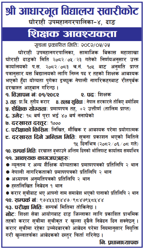 Primary Level Teacher Full Time Dang Posted 3 weeks ago Applications have closed Shree Adharbhut Vidyalaya JOB OPPORTUNITY Position: Teacher No. of Vacancy: 1 Level: Primary Location: Dang Shree Adharbhut Vidyalaya Phone No: 9745533447, 9847958544 Tagged as: Dang