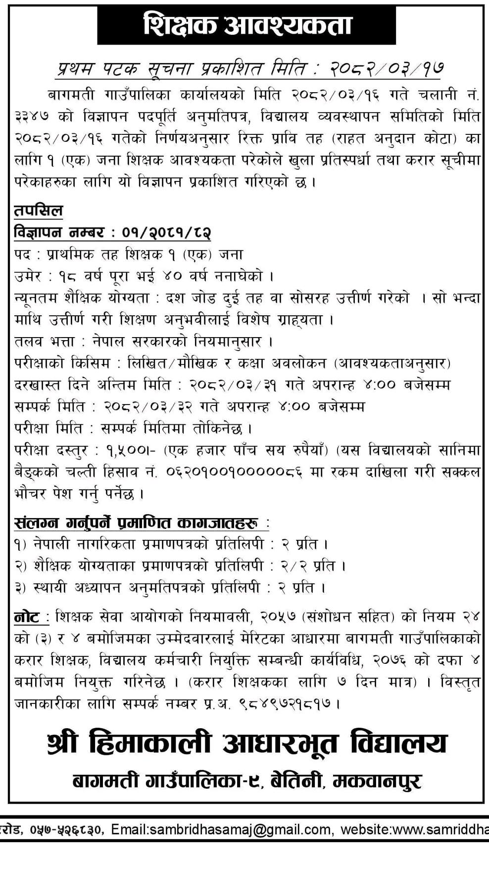 Primary Level Teacher Full Time Makawanpur Posted 3 months ago Applications have closed Shree Himakali Adharbhut Vidyalaya JOB OPPORTUNITY