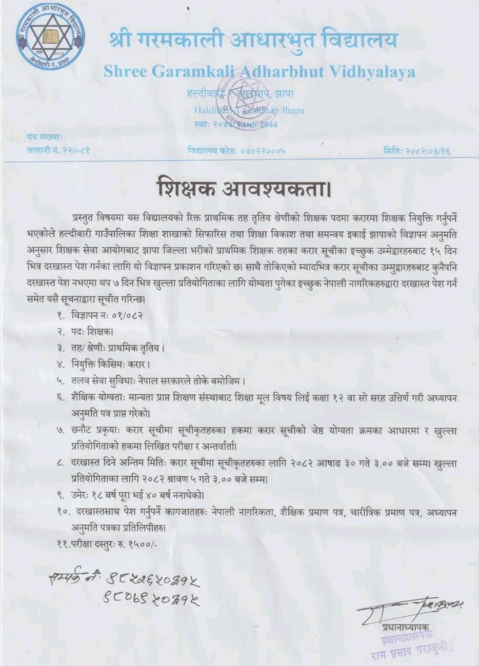 Primary Level Teacher Full Time Jhapa Posted 3 months ago Shree Garamkali Adharbhut Vidhyalaya JOB OPPORTUNITY