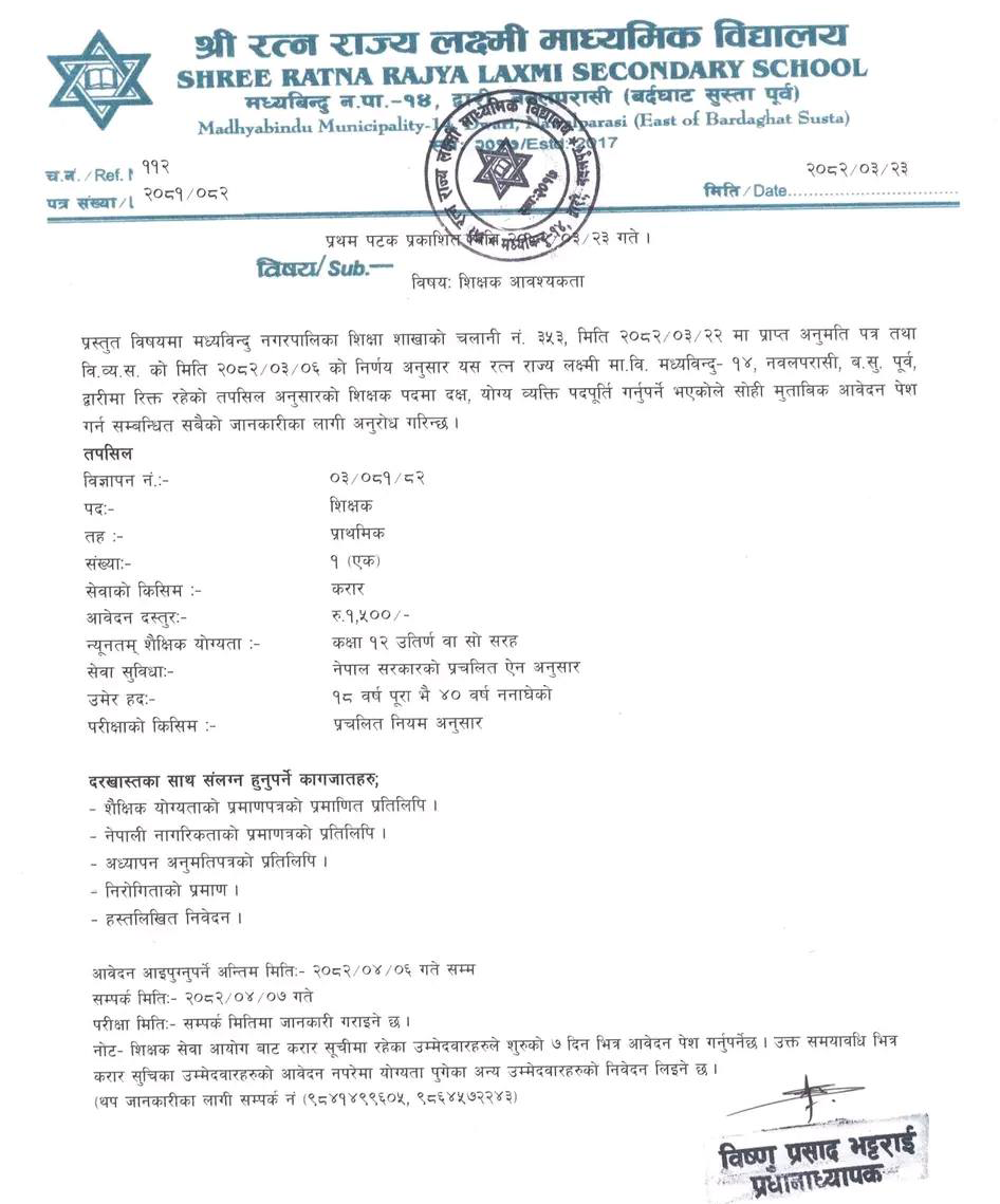 Primary Level Teacher Full Time Nawalparasi Posted 3 months ago Applications have closed Shree Ratna Rajya Laxmi Madhyamik Vidyalaya JOB OPPORTUNITY