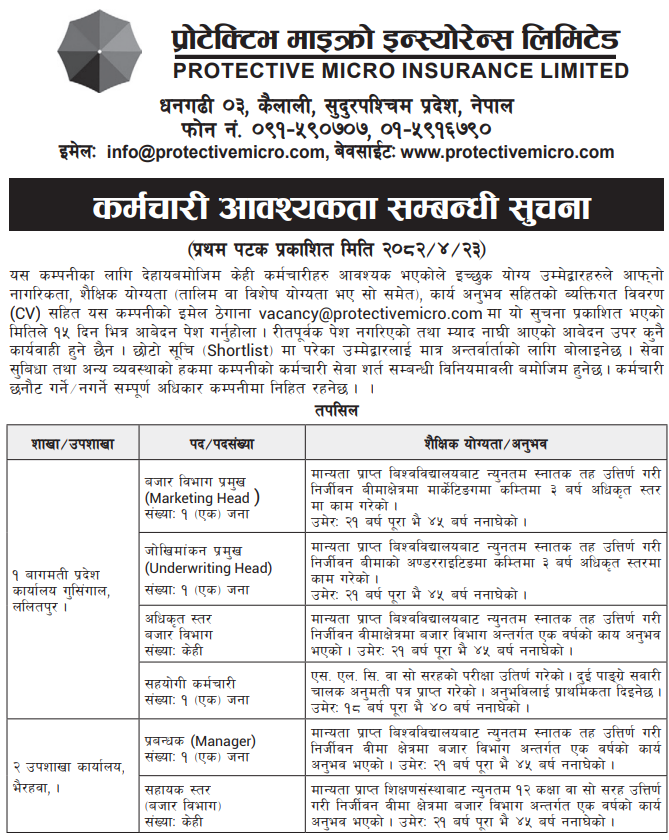 Assistant Level, Officer Level, Marketing Head, Underwriting Head, Manager, Support Staff Full Time Anywhere Posted 2 months ago Applications have closed Website Protective Micro Insurance Limited JOB OPPORTUNITY Source: Nagarik News, 8 August, 2025
