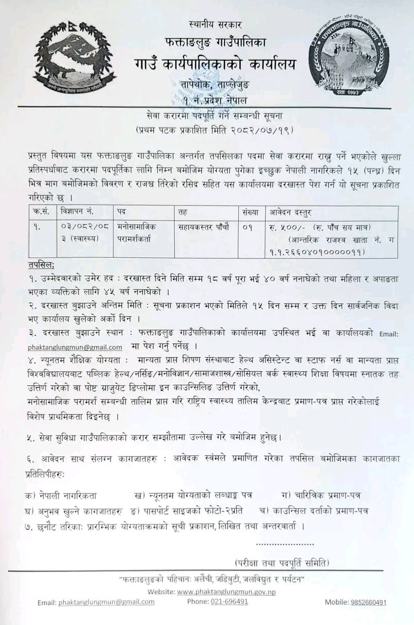 Psychosocial Counsellor Full Time Taplejung Posted 1 week ago Closes: November 19, 2025 Website Phaktanglung Gaunpalika JOB OPPORTUNITY Position: Psychosocial Counsellor No. of Vacancy: 1 Location: Taplejung Phaktanglung Gaunpalika Email: phaktanglungmun@gmail.com Tagged as: Taplejung