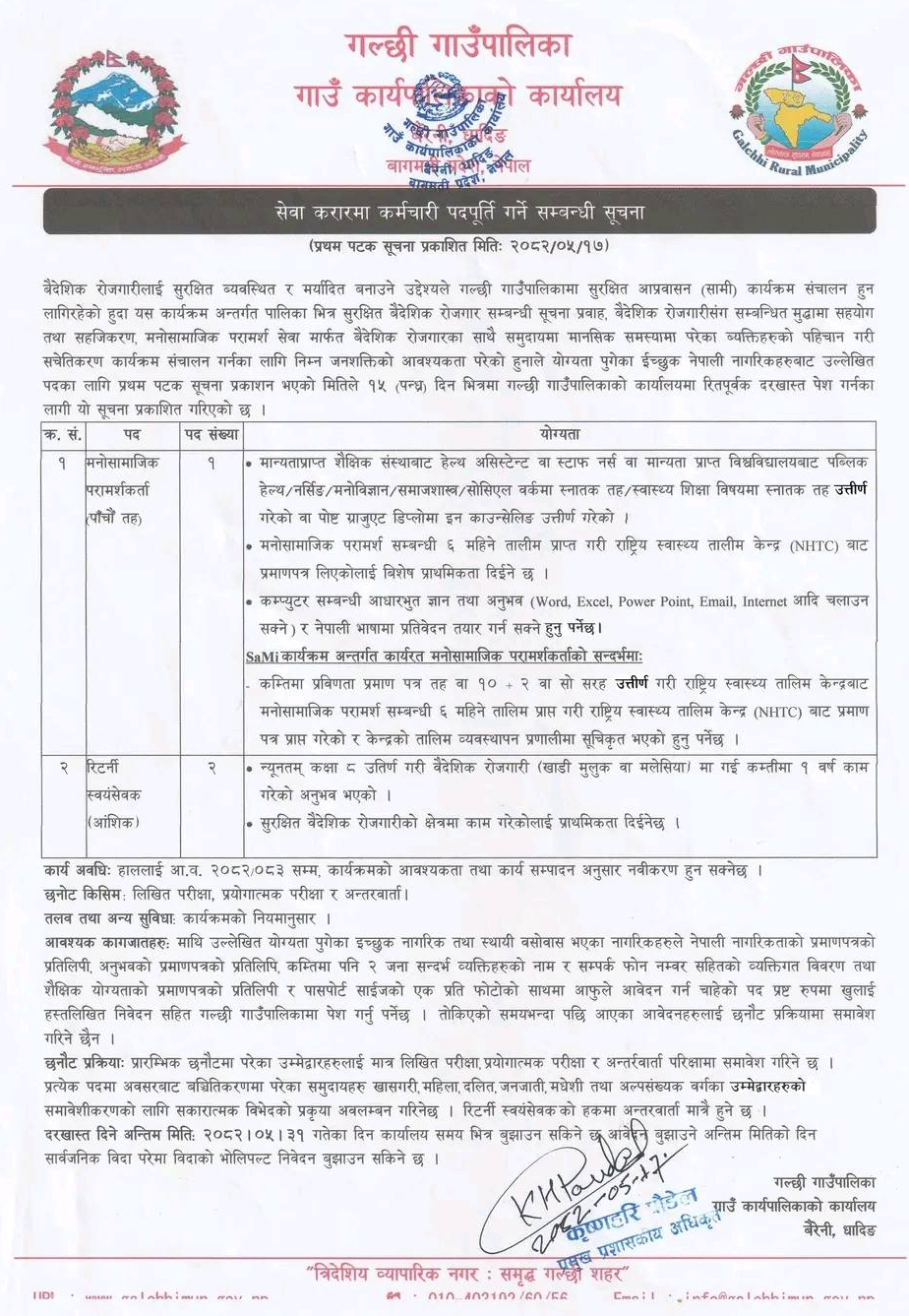 Psychosocial Counsellor, Returnee Volunteer Full Time Dhading Posted 2 months ago Applications have closed Website Galchhi Gaunpalika JOB OPPORTUNITY Position: Psychosocial Counsellor No. of Vacancy: 1 Position: Returnee Volunteer No. of Vacancy: 2 Location: Dhading Galchhi Gaunpalika Tagged as: Dhading