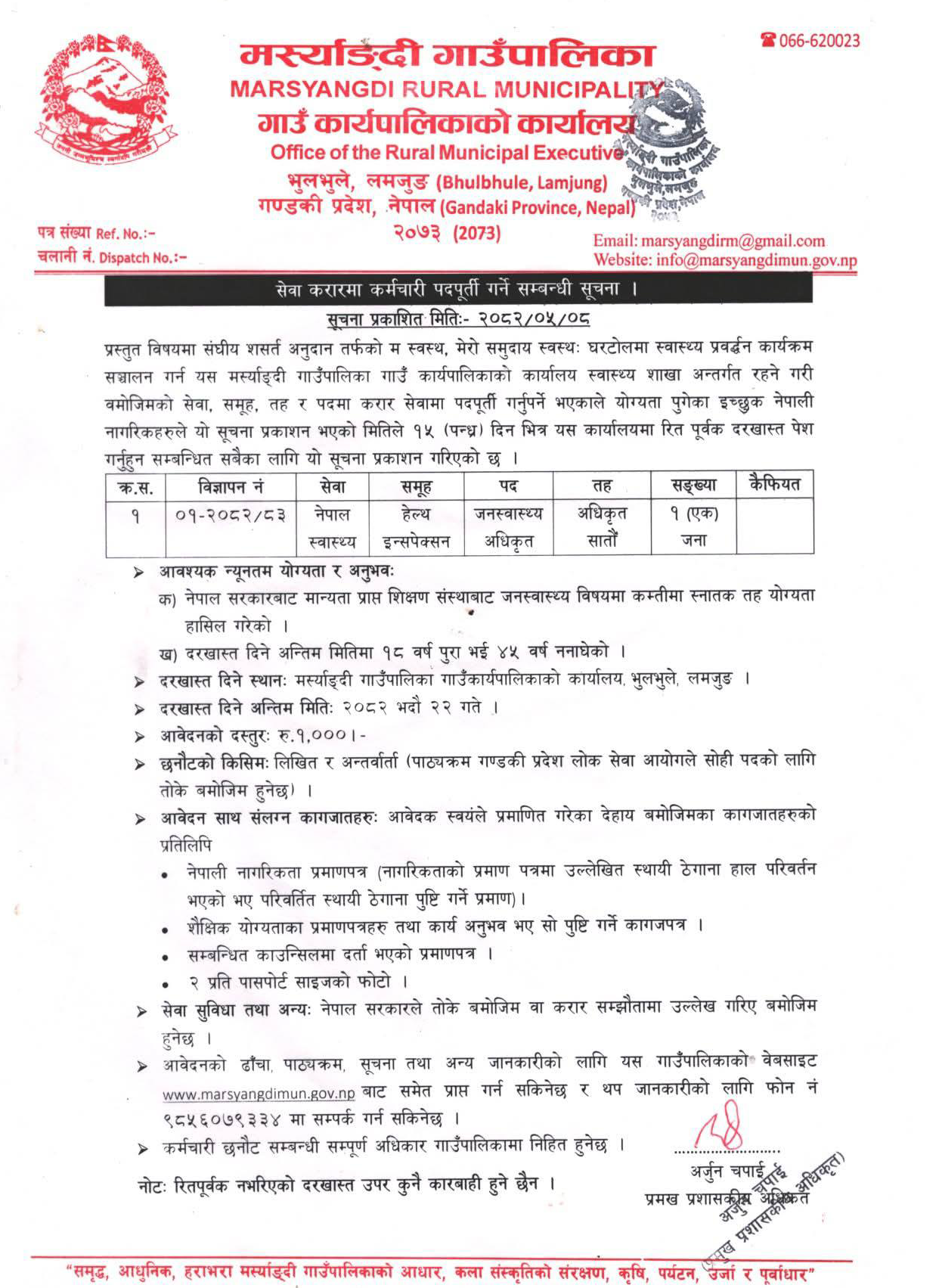 Public Health Officer Full Time Lamjung Posted 1 month ago Applications have closed Website Marsyangdi Gaunpalika JOB OPPORTUNITY Position: Public Health Officer No. of Vacancy: 1 Location: Lamjung Marsyangdi Gaunpalika Website: www.marsyangdimun.gov.np/ Tagged as: Lamjung
