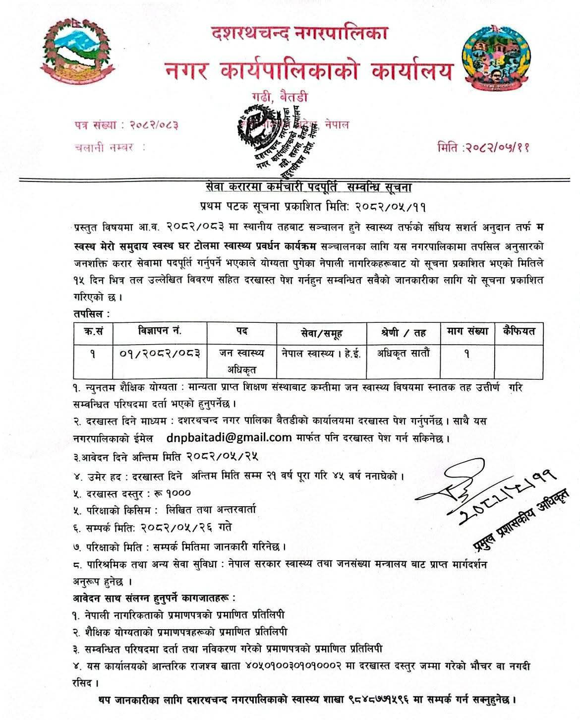 Public Health Officer Full Time Baitadi Posted 1 month ago Applications have closed Website Dashrathchand Nagarpalika JOB OPPORTUNITY Position: Public Health Officer No. of Vacancy: 1 Location: Baitadi Dashrathchand Nagarpalika Email: dnpbaitadi@gmail.com Tagged as: Baitadi