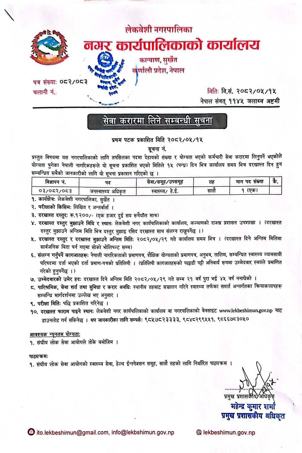 Public Health Officer Full Time Surkhet Posted 1 month ago Applications have closed Website Lekbeshi Nagarpalika JOB OPPORTUNITY Position: Public Health Officer No. of Vacancy: 1 Location: Surkhet Lekbeshi Nagarpalika Phone No.: 9857823333, 9848299551, 9866783050 Tagged as: Surkhet
