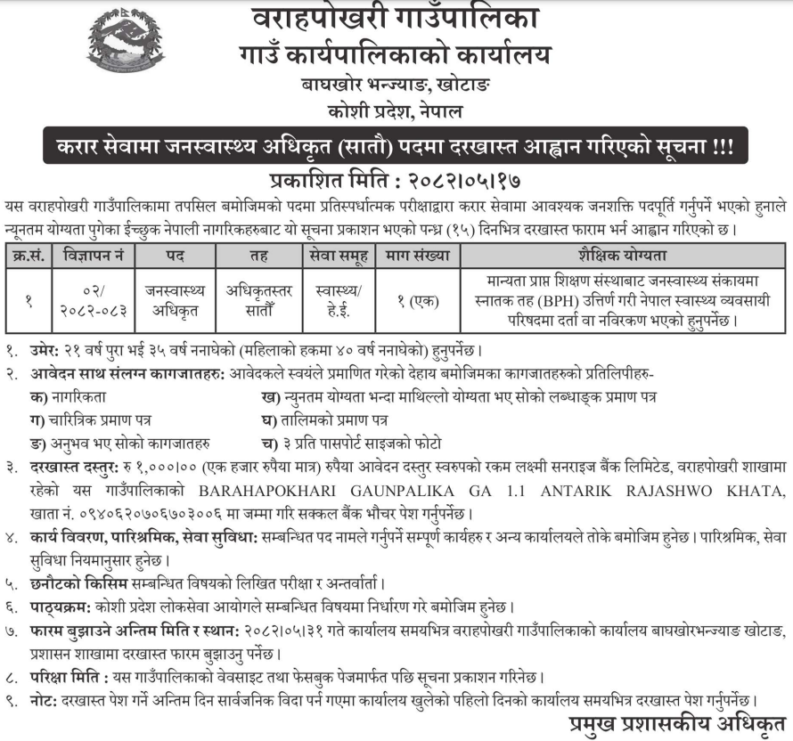 Public Health Officer Full Time Khotang Posted 1 month ago Applications have closed Website Barahapokhari Gaunpalika JOB OPPORTUNITY Tagged as: Khotang
