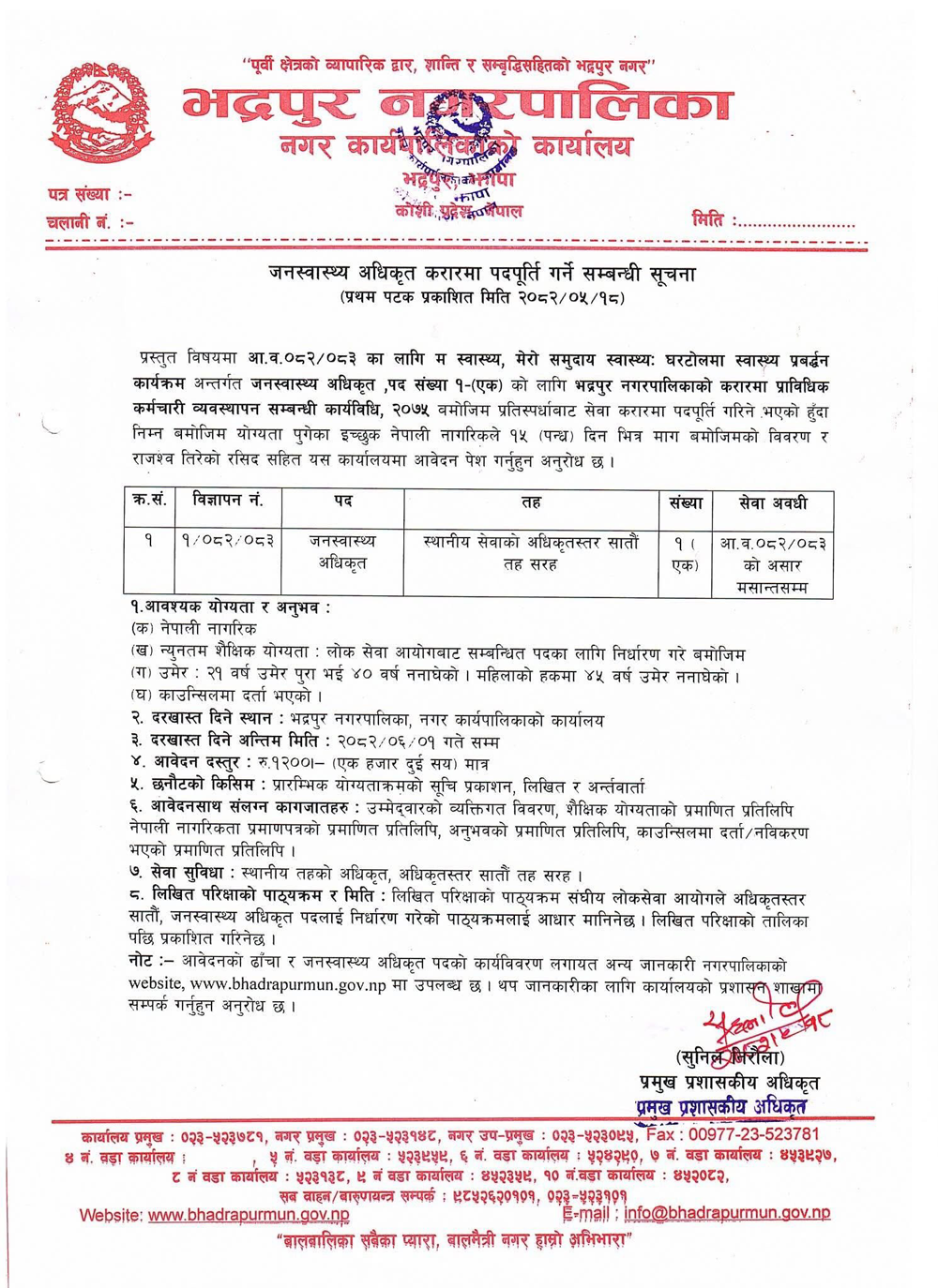 Public Health Officer Full Time Jhapa Posted 4 weeks ago Applications have closed Website Bhadrapur Nagarpalika JOB OPPORTUNITY Position: Public Health Officer No. of Vacancy: 1 Location: Jhapa Bhadrapur Nagarpalika Website: www.bhadrapurmun.gov.np/ Tagged as: Jhapa