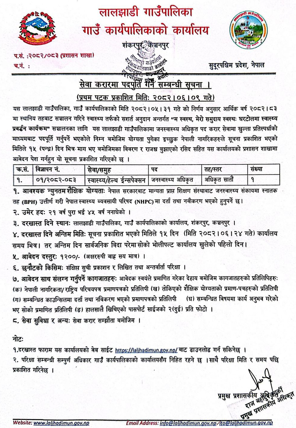 Public Health Officer Full Time kanchanpur Posted 6 days ago Closes: October 10, 2025 Website Laljhadi Gaunpalika JOB OPPORTUNITY Position: Public Health Officer No. of Vacancy: 1 Location: kanchanpur Laljhadi Gaunpalika Website: www.laljhadimun.gov.np/ Tagged as: Kanchanpur