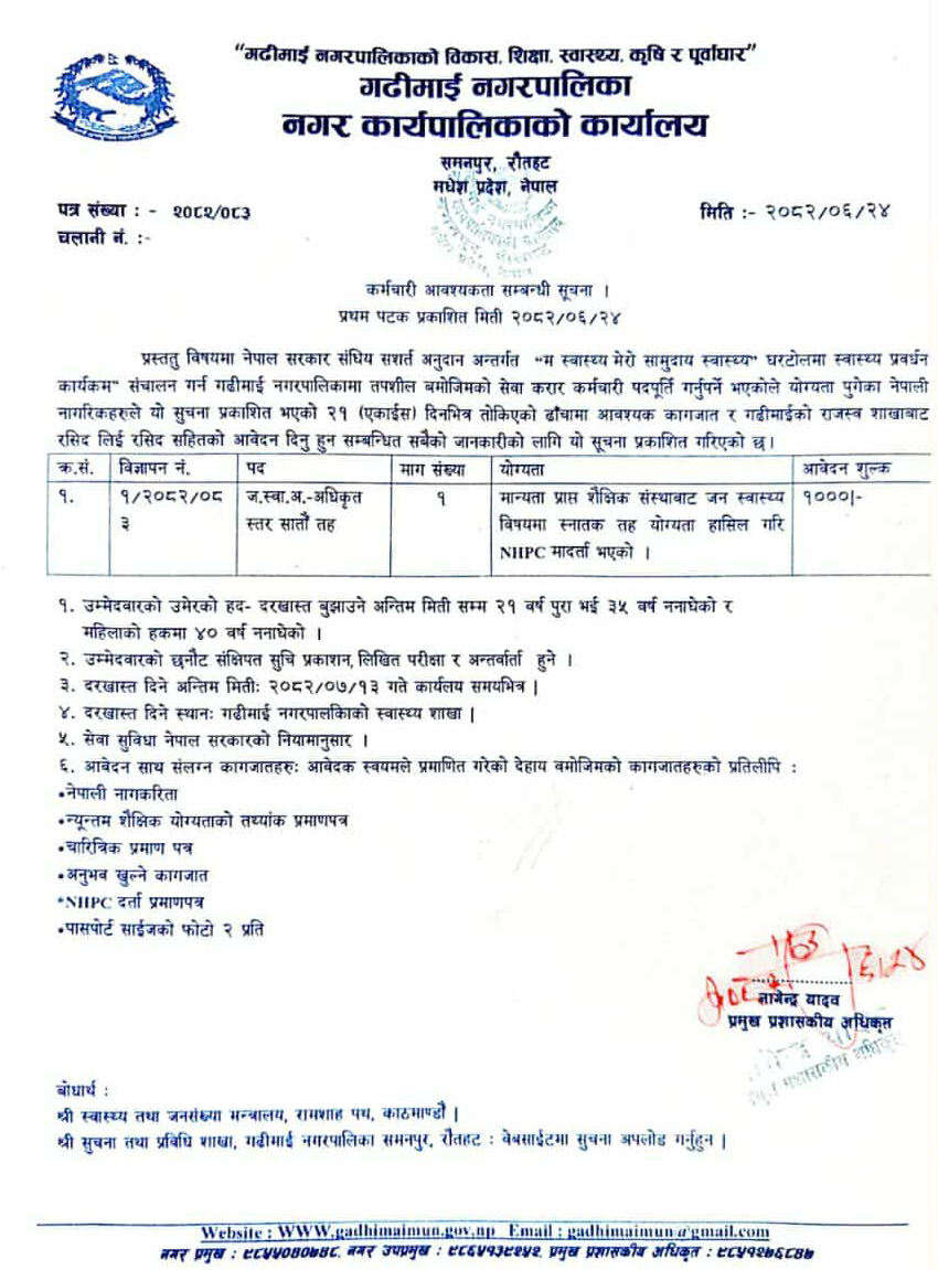 Public Health Officer Full Time Rautahat Posted 1 week ago Closes: October 30, 2025 Website Gadhimai Nagarpalika JOB OPPORTUNITY Position: Public Health Officer Required No.: 1 Location: Rautahat Gadhimai Nagarpalika Tagged as: Rautahat