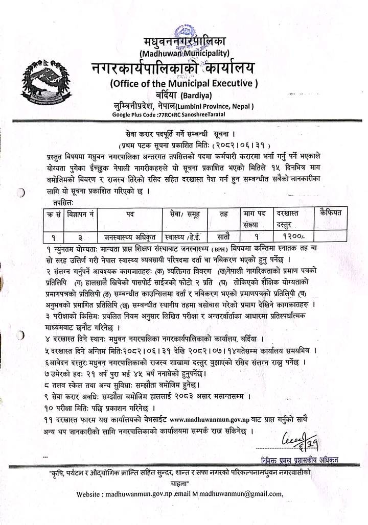 Public Health Officer Full Time Bardiya Posted 4 days ago Closes: October 31, 2025 Website Madhuban Nagarpalika JOB OPPORTUNITY Position: Public Health Officer No. of Vacancy: 1 Location: Bardiya Madhuban Nagarpalika Website: https://madhuwanmun.gov.np/ Tagged as: Bardiya