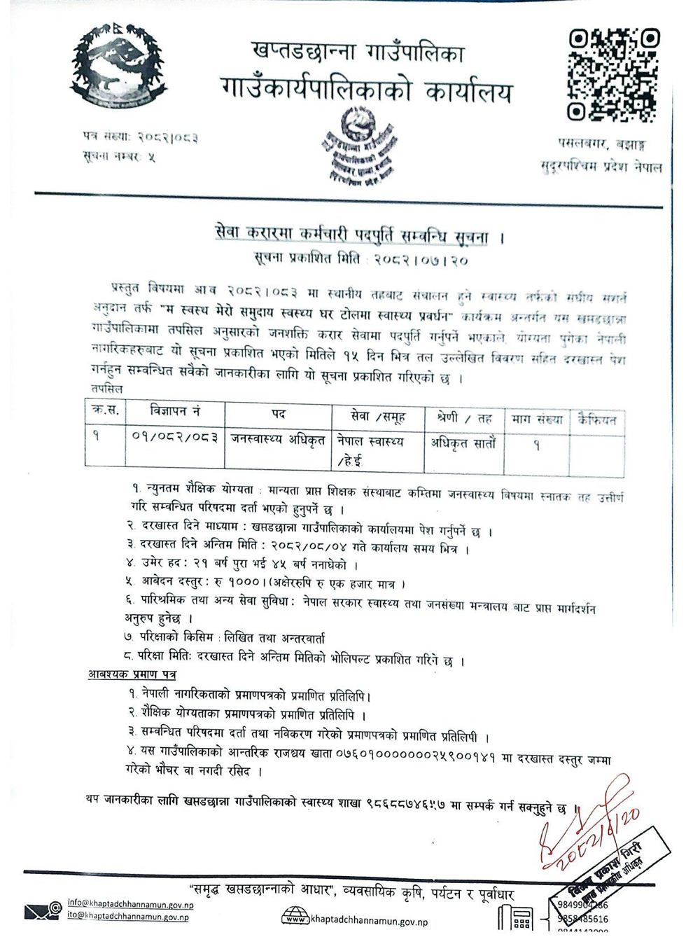 Public Health Officer Full Time Bajhang Posted 1 week ago Closes: November 20, 2025 khaptadchhanna Gaunpalika JOB OPPORTUNITY Position: Public Health Officer No. of Vacancy: 1 Location: Bajhang khaptadchhanna Gaunpalika Phone No.: 9868874657 Tagged as: Bajhang