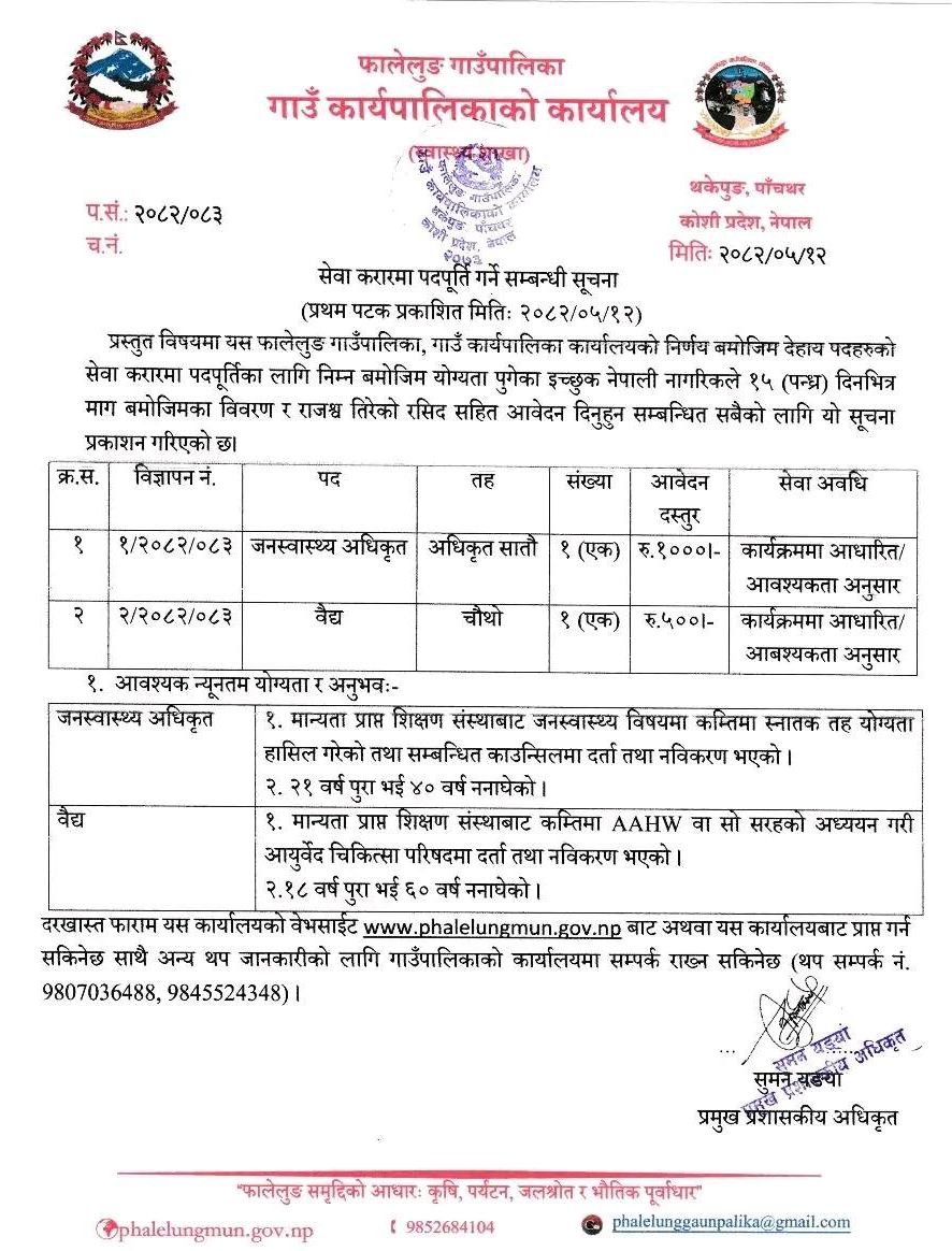 Public Health Officer, Vaidya Full Time Panchthar Posted 1 month ago Applications have closed Website Phalelung Gaunpalika JOB OPPORTUNITY Position: Public Health Officer No. of Vacancy: 1 Position: Vaidya No. of Vacancy: 1 Location: Panchthar Phalelung Gaunpalika Website: www.phalelungmun.gov.np Phone No.: 9807036488, 9845524348 Tagged as: Panchthar