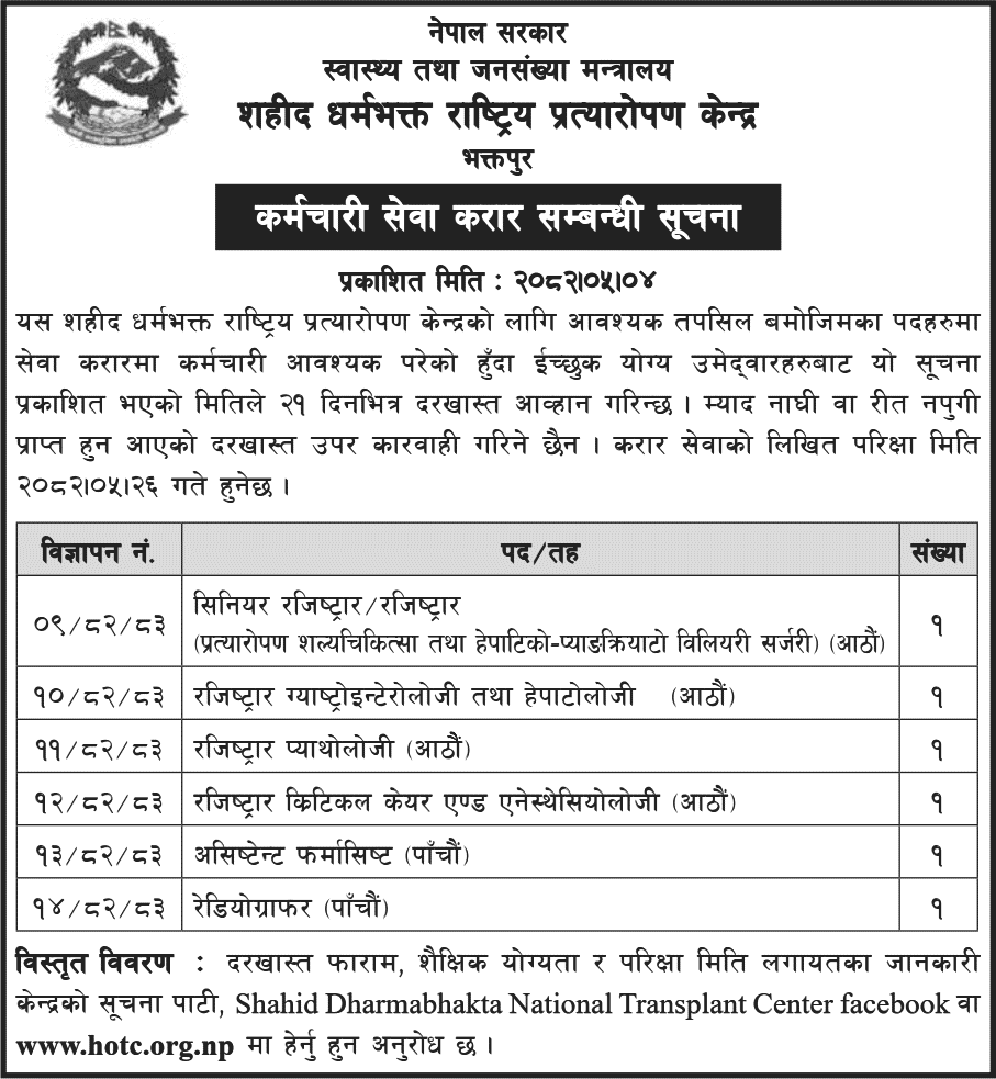 Radiographer, Assistant Pharmacist, Senior Registrar / Registrar Full Time Bhaktapur Posted 1 month ago Applications have closed Website Shahid Dharmabhakta National Transplant Center JOB OPPORTUNITY Tagged as: Bhaktapur