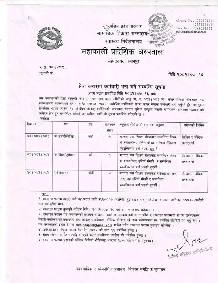 Radiographer, Pediatrician, Dermatologist Full Time kanchanpur Posted 2 weeks ago Applications have closed Mahakali Provincial Hospital JOB OPPORTUNITY Position: Dermatologist No. of Vacancy:1 Position: Pediatrician No. of Vacancy: 1 Position: Radiographer No. of Vacancy:3 Location: Mahendranagar, kanchanpur Mahakali Provincial Hospital Email: mzh.hospital@gmail.com Tagged as: Kanchanpur
