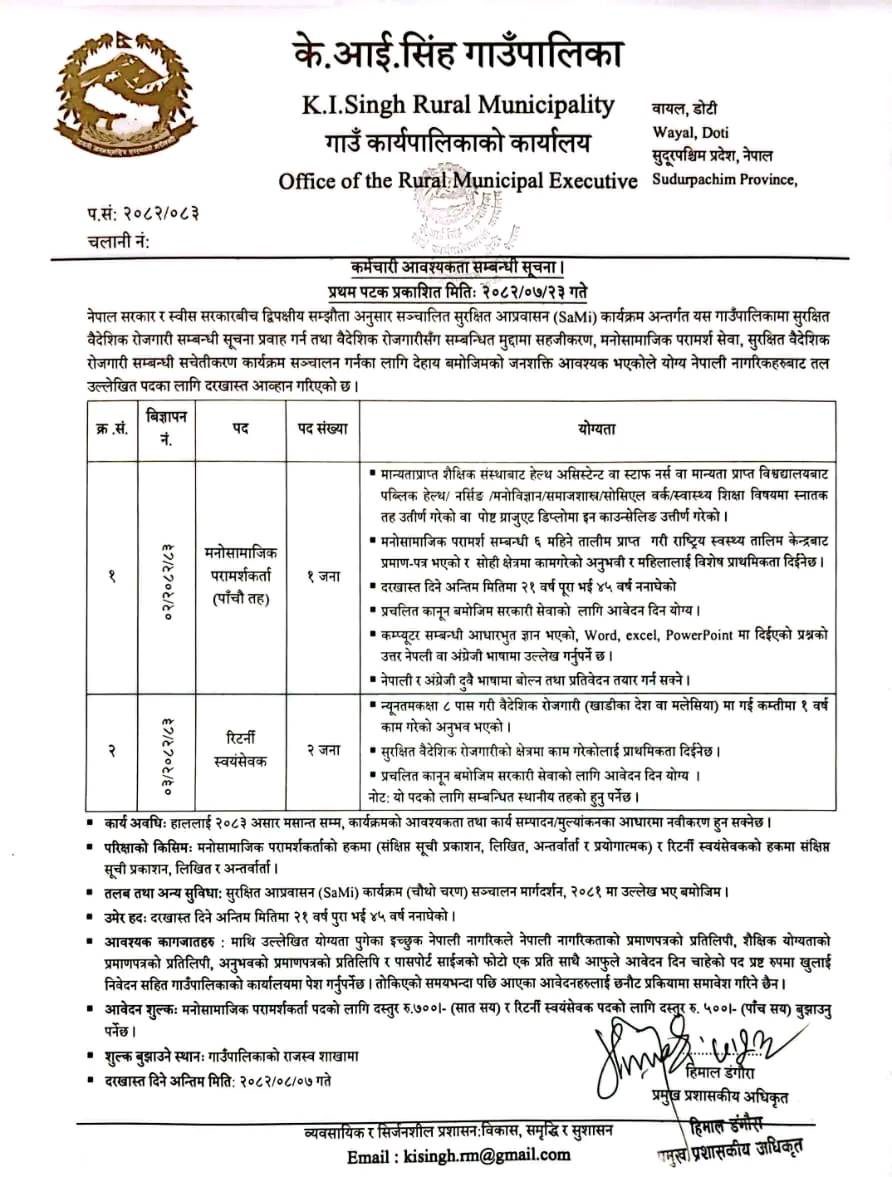 Returnee Volunteer, Psychosocial Counsellor Full Time Doti Posted 1 week ago Closes: November 23, 2025 Website K.I.Sing Gaunpalika JOB OPPORTUNITY Position: Psychosocial Counsellor No. of Vacancy: 1 Position: Returnee Volunteer No. of Vacancy: 2 Location: Doti K.I.Sing Gaunpalika Tagged as: Doti