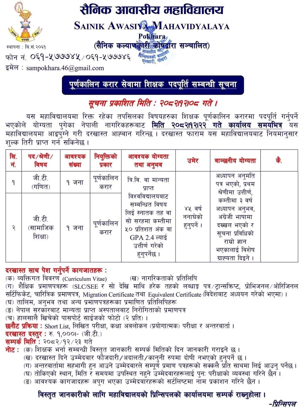 Social Teacher, Math Teacher Full Time Pokhara Posted 1 week ago Closes: April 5, 2026 Sainik Awasiya Mahavidyalaya JOB OPPORTUNITY Tagged as: Pokhara