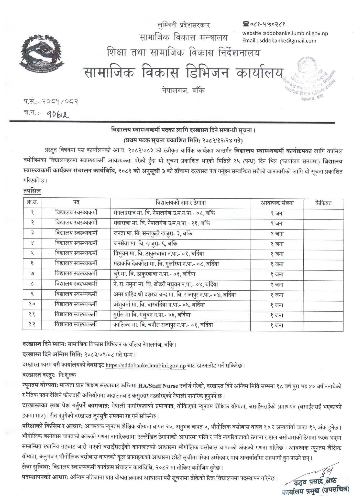 School Health Worker – 12 Vacancies