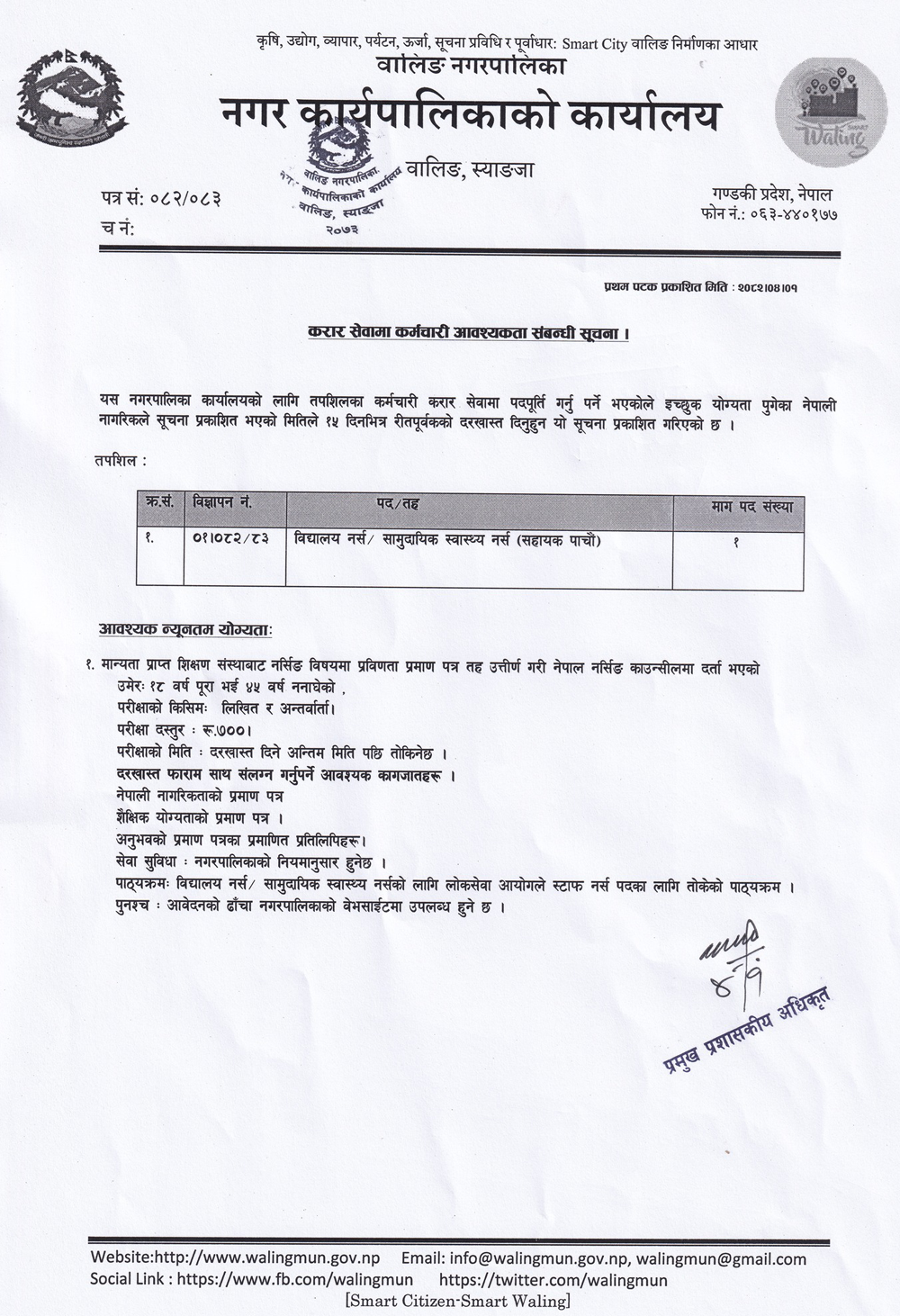 School Nurse Full Time Syangja Posted 3 months ago Applications have closed Website Waling Nagarpalika JOB OPPORTUNITY Position: School Nurse No. of Vacancy: 1 Location: Waling, Syangja Waling Nagarpalika Tagged as: Syangja