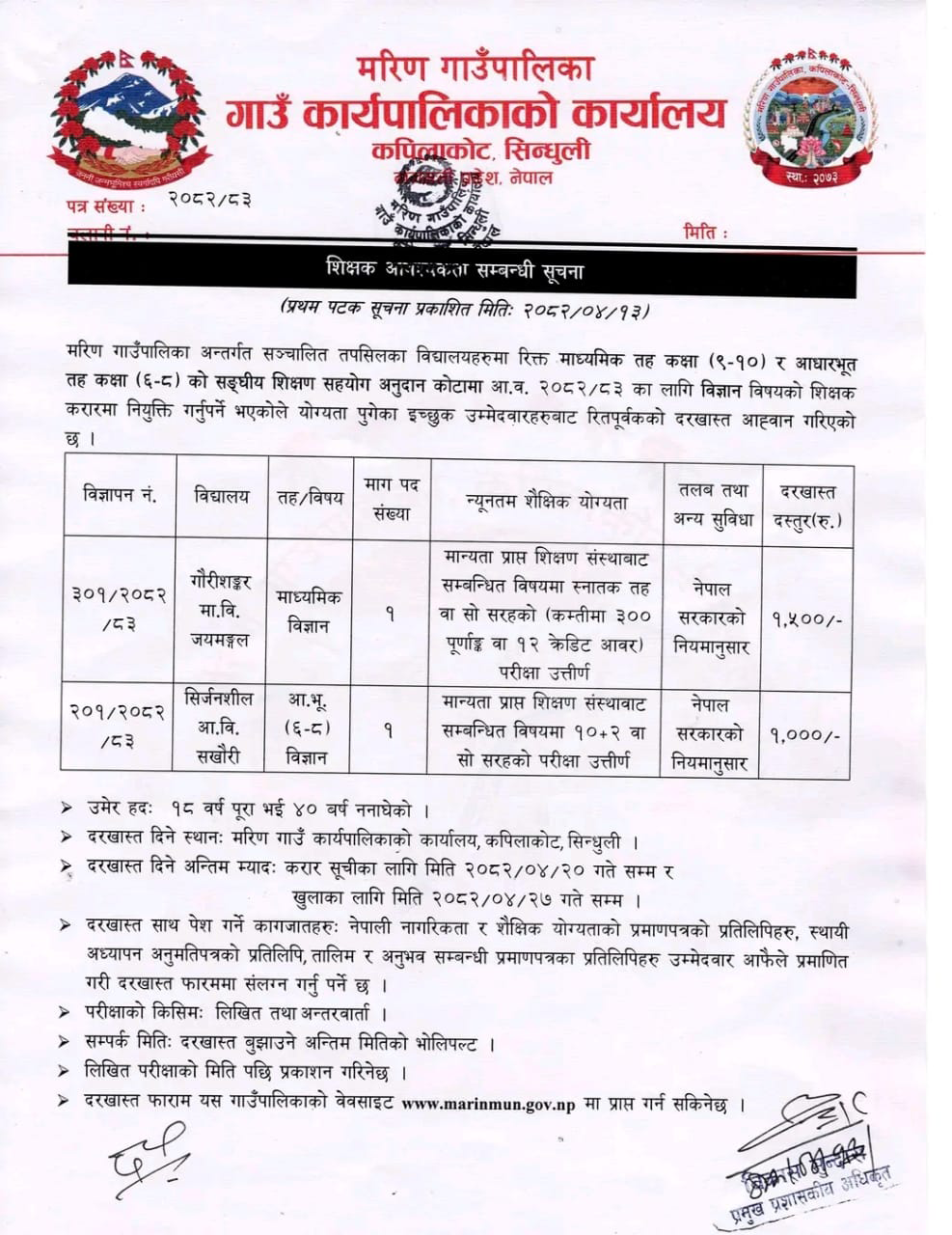 Science Teacher Full Time Sindhuli Posted 2 months ago Applications have closed Website Marin Gaunpalika JOB OPPORTUNITY Tagged as: Sindhuli