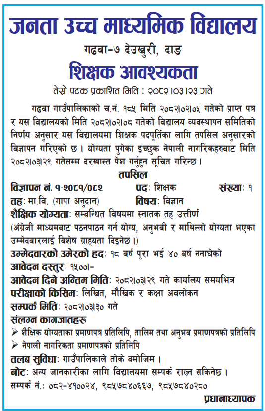 Science Teacher Full Time Dang Posted 3 months ago Applications have closed Janata Higher Madhyamik Vidyalaya JOB OPPORTUNITY Tagged as: Dang