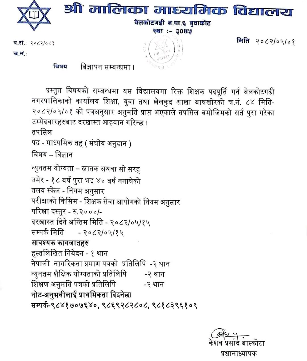 Science Teacher Full Time Nuwakot Posted 1 month ago Applications have closed Shree Malika Madhyamik Vidyalaya JOB OPPORTUNITY Position: Teacher Subject: Science Level: Secondary No. of Vacancy: 1 Location: Nuwakot Shree Malika Madhyamik Vidyalaya Phone No.: 9841707640, 9869282808, 9818396109 Tagged as: Nuwakot