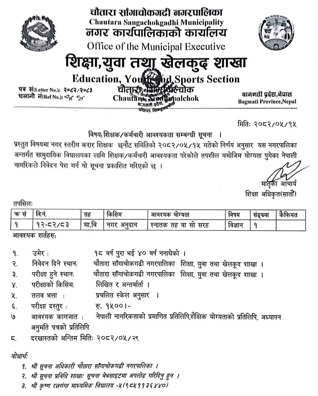 Science Teacher Full Time Sindhupalchok Posted 1 month ago Applications have closed Website Chautara Sanggachokgadhi Nagarpalika JOB OPPORTUNITY Position: Teacher Level: Secondary Subject: Science No. of Vacancy: 1 Location: Sindhupalchok Chautara Sanggachokgadhi Nagarpalika Phone No.: 9851136440 Tagged as: Sindhupalchok