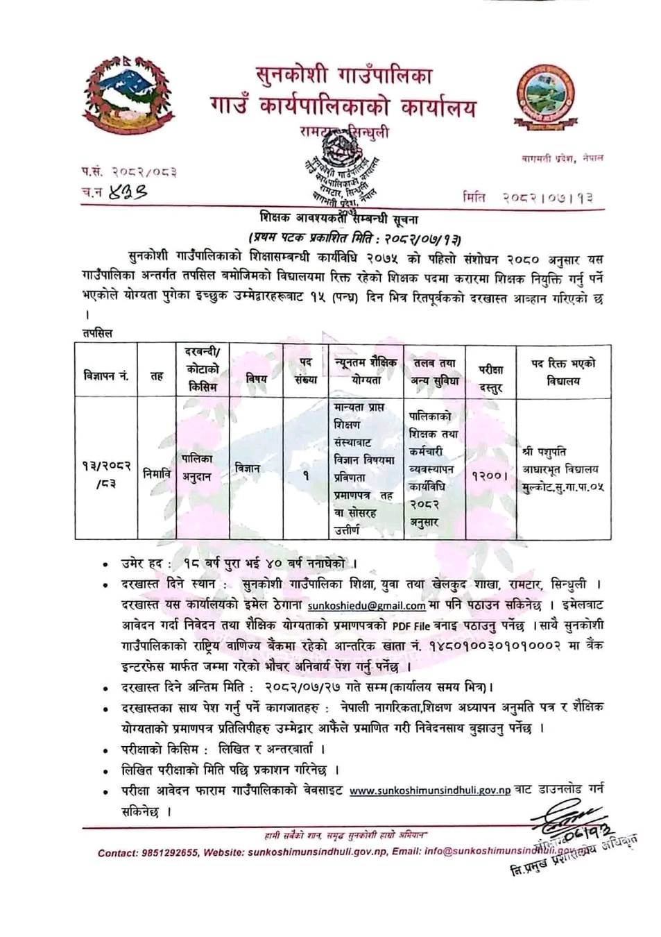 Science Teacher Full Time Sindhuli Posted 2 weeks ago Applications have closed Website Sunkoshi Gaunpalika JOB OPPORTUNITY Position: Teacher Level: Secondary No. of Vacancy:. 1 Subject: Science Location: Sindhuli Sunkoshi Gaunpalika Email: sunkoshiedu@gmail.com Website: https://sunkoshimunsindhuli.gov.np/ Tagged as: Sindhuli