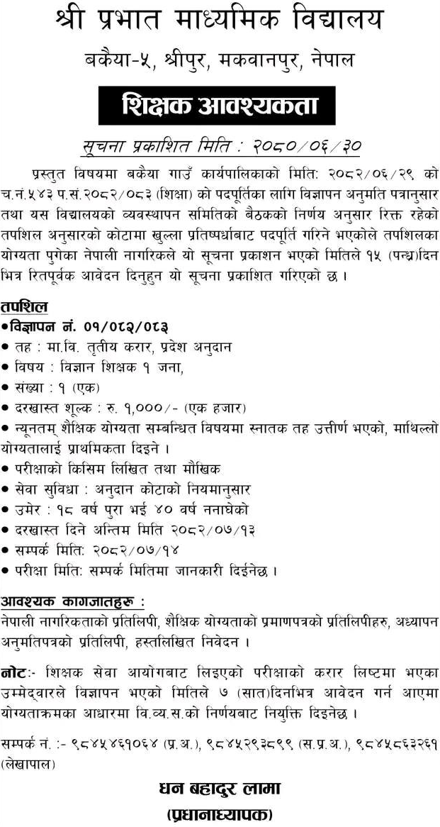 Science Teacher Full Time Makwanpur Posted 6 days ago Closes: October 30, 2025 Shree Prabhat Madhyamik Vidyalaya JOB OPPORTUNITY Position: Teacher Subject: Science Level: Secondary Location: Makwanpur Shree Prabhat Madhyamik Vidyalaya Phone No.: 9845461064, 9845293899, 9845863261 Tagged as: Makwanpur