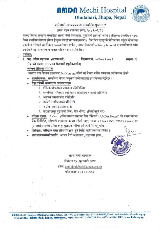 Senior Assistant (Staff Nurse) Full Time Jhapa Posted 4 days ago Closes: October 23, 2025 Website Amda Mechi Hospital JOB OPPORTUNITY Position: Senior Assistant (Staff Nurse) No. of Vacancy: 1 Location: Jhapa Amda Mechi Hospital Email: amh.dhulabari@amda.org.np Phone No.: 023-564550 Tagged as: Jhapa