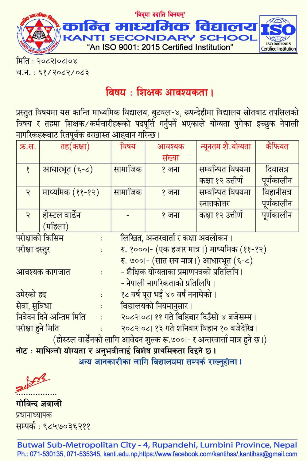 Position: Hostel Warden (Female)