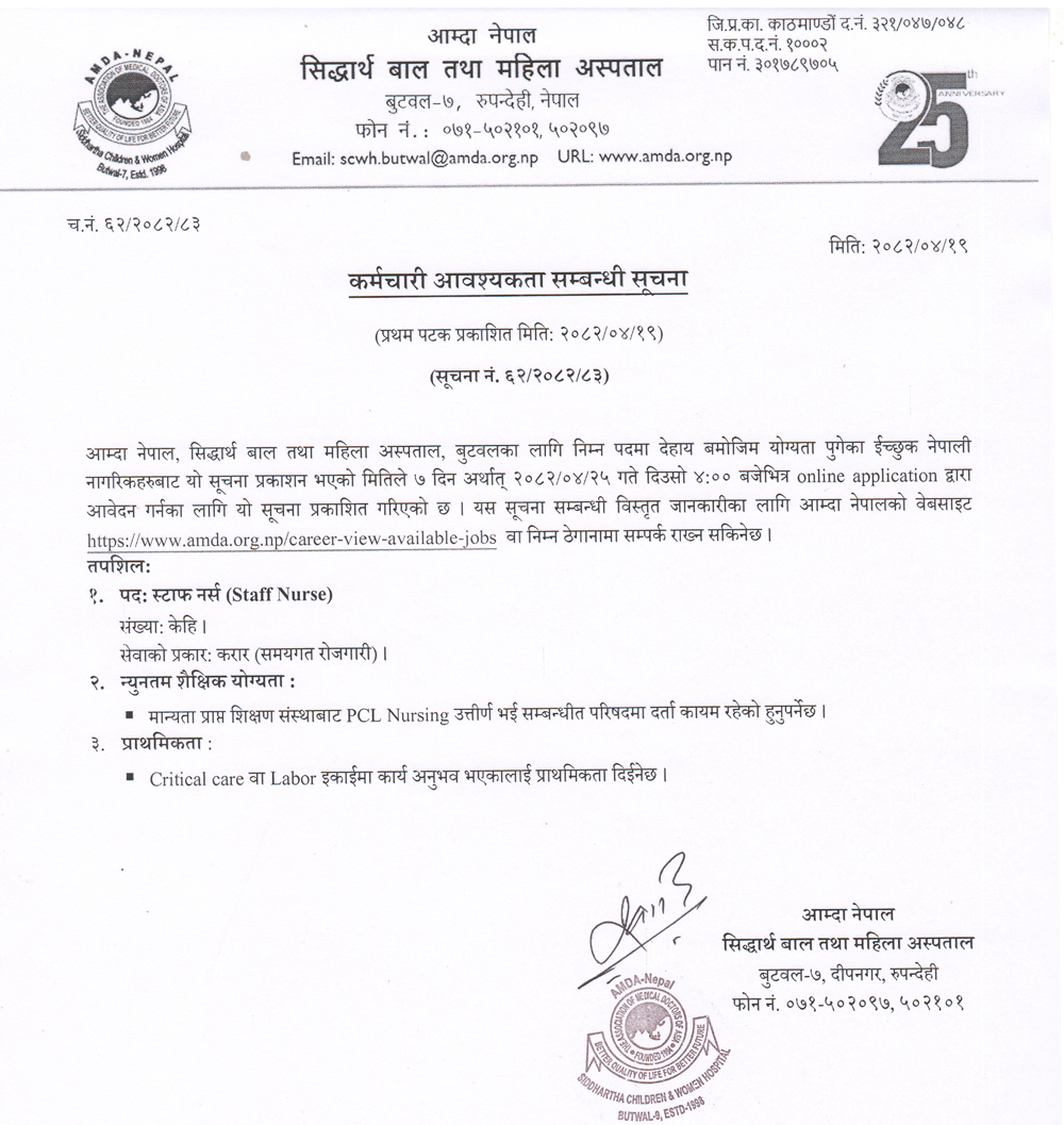 Staff Nurse Full Time Butwal Posted 2 months ago Applications have closed Website AMDA Nepal JOB OPPORTUNITY Position: Staff Nurse Number of Vacancy: Few Location: Butwal
